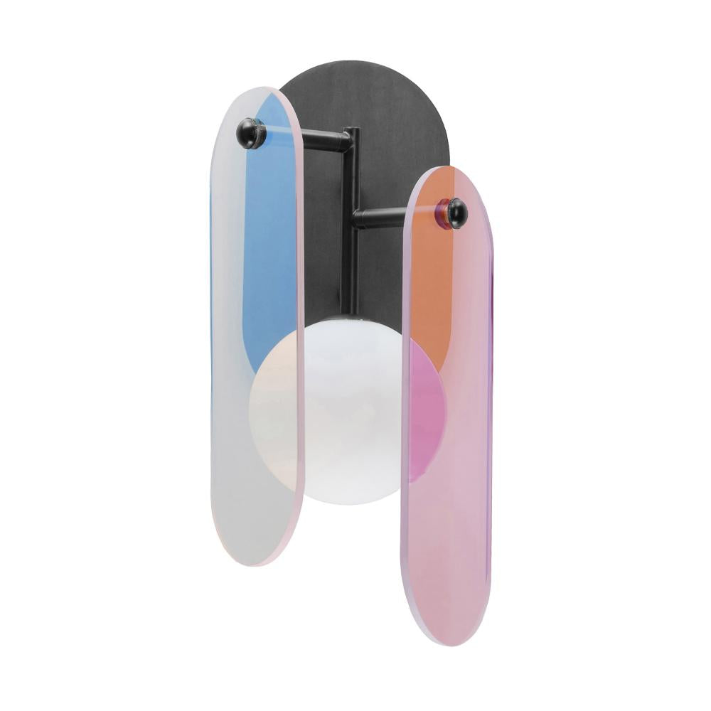 Studio M MEGALITH - GLASS SM24810DCGM Sconce Traditional - Gunmetal. A Monument To The Art Of Glass The Megalith Collection Is Constructed Using A Robust Iron Stem That Branches Off To Support Various Panel Options These Various Elliptical Panels Are Back Lit With Globes Of White Cased Glass In This Iteration Of The Series Various Glass Panels Are Offered With Retro Modern Appeal Choose From Award Winning Dichroic Glass Amber Glass Or Grey Smoked Glass Panels Pair Them With Your Choice Of Framework Either Natural Aged Brass Gunmetal Or Brushed Bronze With Additional Made To Order Configurations This Series Appeals To A Wide Variety Of Applications Be It Suspended Or Wall Mounted Studio M MPN: SM24810DCGM